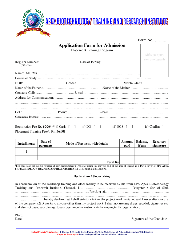 Form No. Application Form for Admission