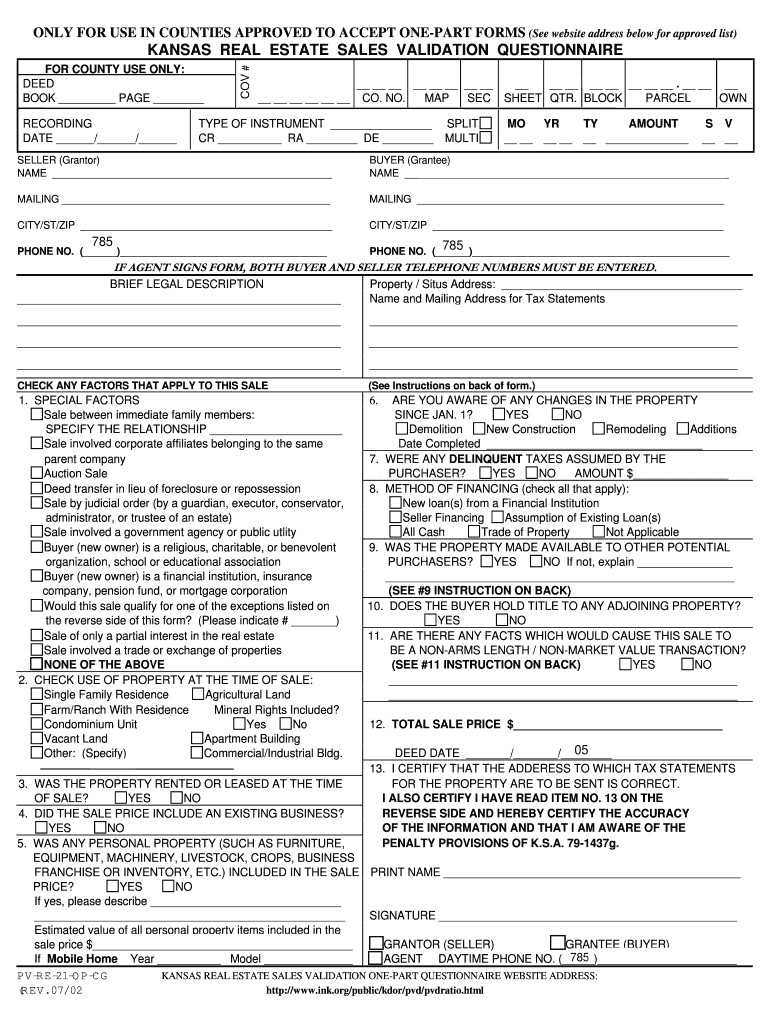 For clarity, a filled-out sample of the Kansas Real Estate Sales Validation Questionnaire is available. It includes: