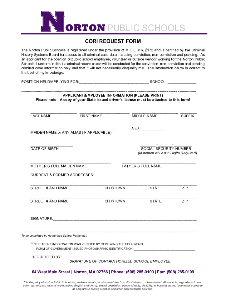 The Norton Public Schools is registered under the provision of M.G.L. c.6, 172 and is certified by the Criminal