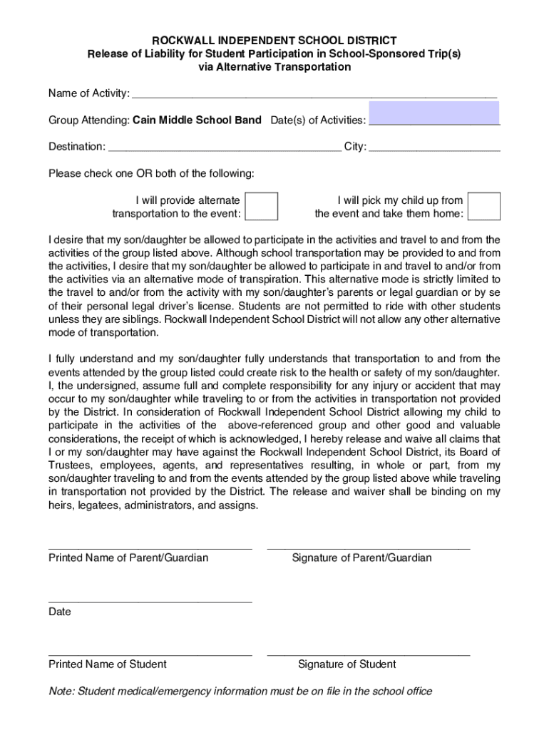 ROCKWELL INDEPENDENT SCHOOL DISTRICT Release of Liability for Student Participation in SchoolSponsored Trip(s) via Alternative Transportation Name of Activity: Group Attending: Cain Middle School