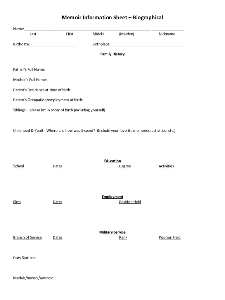 Memoir Information Sheet Biographical Name: Last First Middle (Maiden) Nickname Birthdate: Birthplace: Family History Fathers Full Name: Mothers Full Name: Parents Residence at time of birth: Parents