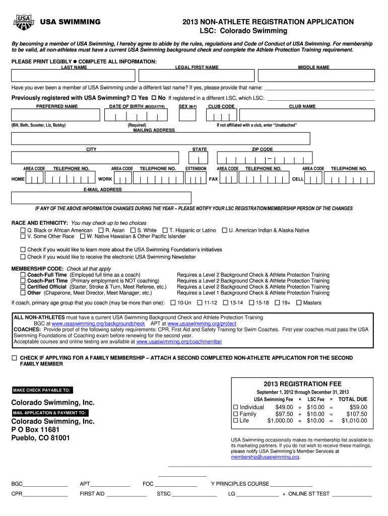 USA SWIMMING 2013 NON-ATHLETE REGISTRATION APPLICATION LSC: Colorado Swimming By becoming a member of USA Swimming, I hereby agree to abide by the rules, regulations and Code of Conduct of USA Swimming.