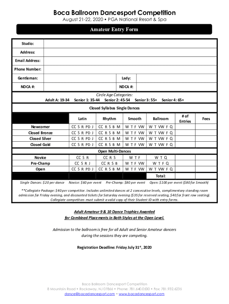 Coca Ballroom Dance sport Competition August 2122, 2020 PGA National Resort & Amateur Entry Form Studio: Address: Email Address: Phone Number: Gentleman:Lady:NACA #:NACA #: Adult A: 1934Circle Age