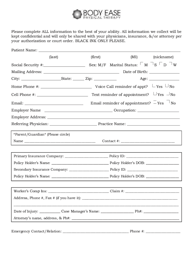 Please complete ALL information to the best of your ability. All information we collect will be kept confidential and will only be shared with your physicians, insurance, &/or attorney per your authorization