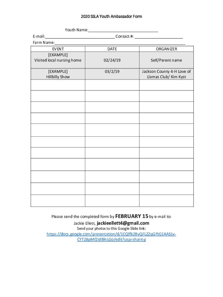 2020 SLA Youth Ambassador Form Youth Name: Email: Contact #: Farm Name: EVENT DATE ORGANIZER EXAMPLE Visited local nursing home 02/24/19 Self/Parent name EXAMPLE Hillbilly Show03/2/19Jackson County