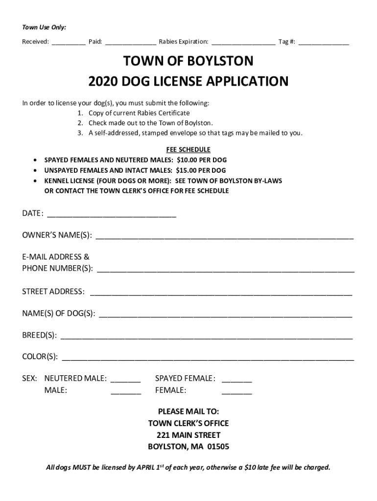 Town Use Only: Received: Paid: Rabies Expiration: Tag #: TOWN OF BOSTON 2020 DOG LICENSE APPLICATION In order to license your dog(s), you must submit the following: 1. Copy of current Rabies Certificate