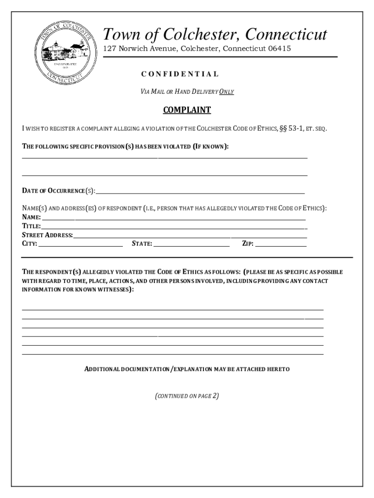 Town of Colchester, Connecticut 127 Norwich Avenue, Colchester, Connecticut 06415 CONFIDENTIAL VIA MAIL OR HAND DELIVERY ONLYCOMPLAINT I WISH TO REGISTER A COMPLAINT ALLEGING A VIOLATION OF THE COLCHESTER