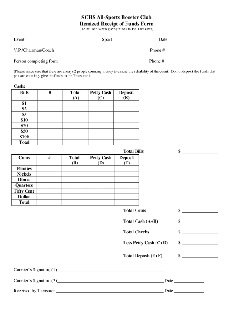 SACHS Allport Booster Club Itemized Receipt of Funds Form (To be used when giving funds to the Treasurer)Event Sport Date V.P./Chairman/Coach Phone # Person completing form Phone # (Please make sure