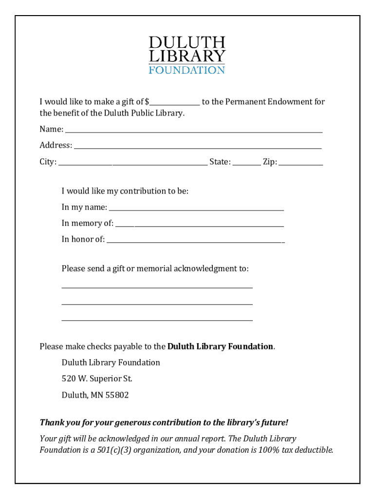 I would like to make a gift of $ to the Permanent Endowment for the benefit of the Duluth Public Library. Name: Address: City: State: Zip: I would like my contribution to be: In my name: In memory
