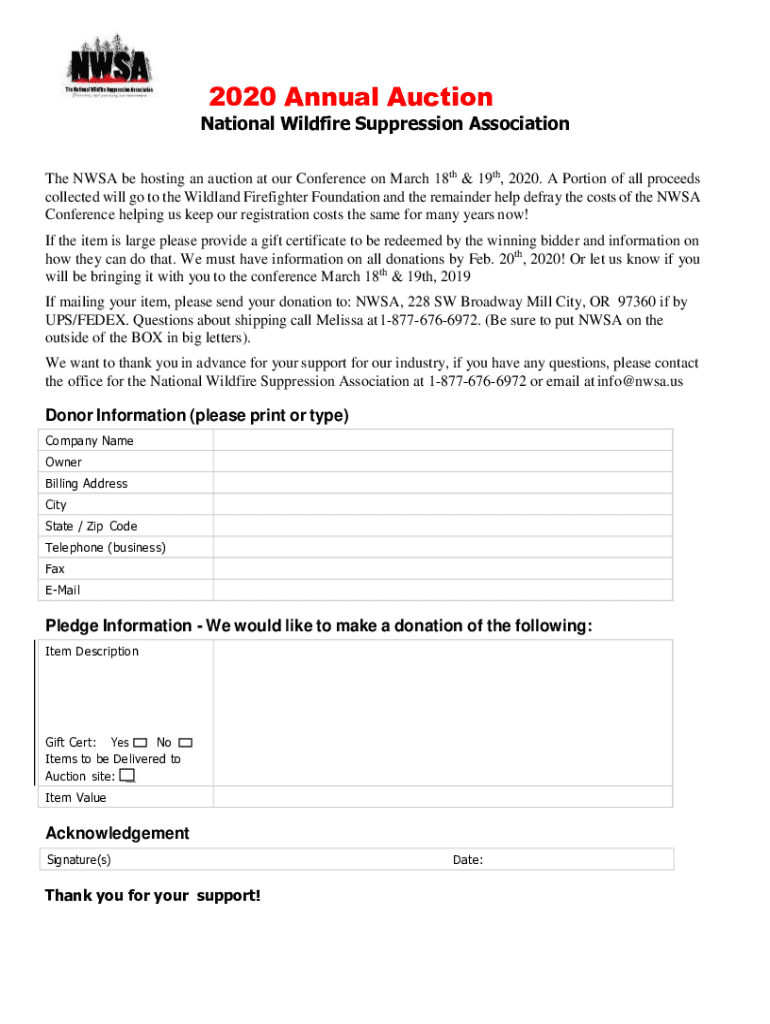 2020 Annual Auction National Wildfire Suppression Association The NASA be hosting an auction at our Conference on March 18th & 19th, 2020. A Portion of all proceeds collected will go to the Wild land