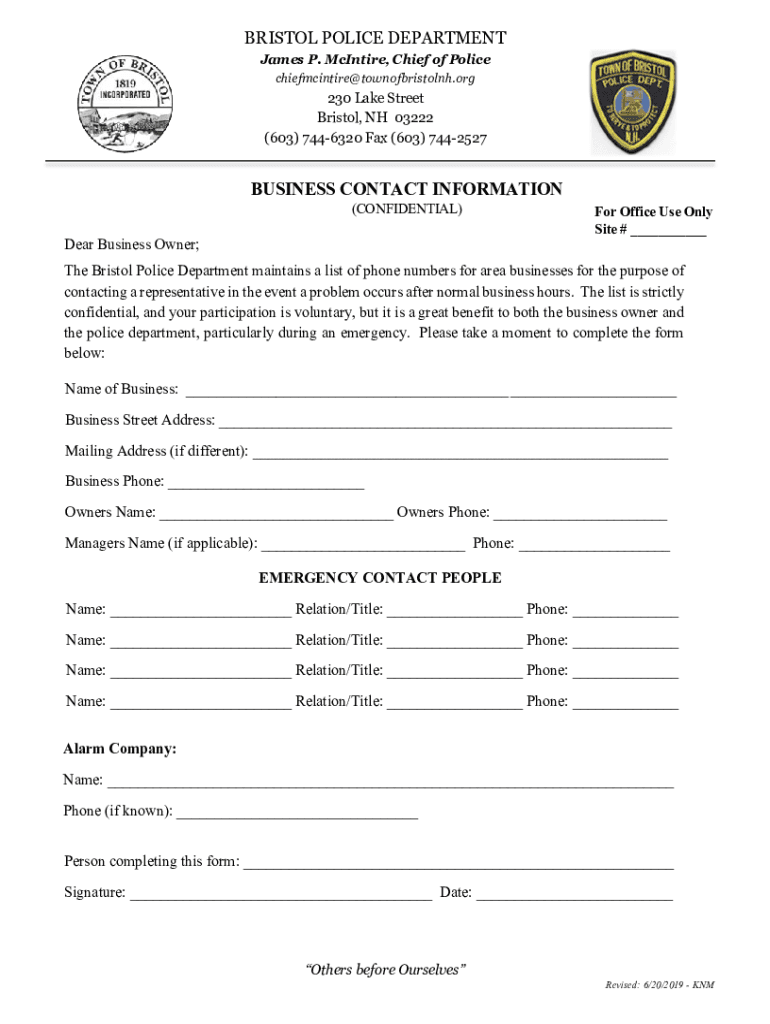 BRISTOL POLICE DEPARTMENT James P. McIntyre, Chief of Police chiefmcintire townofbristolnh.org230 Lake Street Bristol, NH 03222 (603) 7446320 Fax (603) 7442527BUSINESS CONTACT INFORMATION (CONFIDENTIAL)Dear