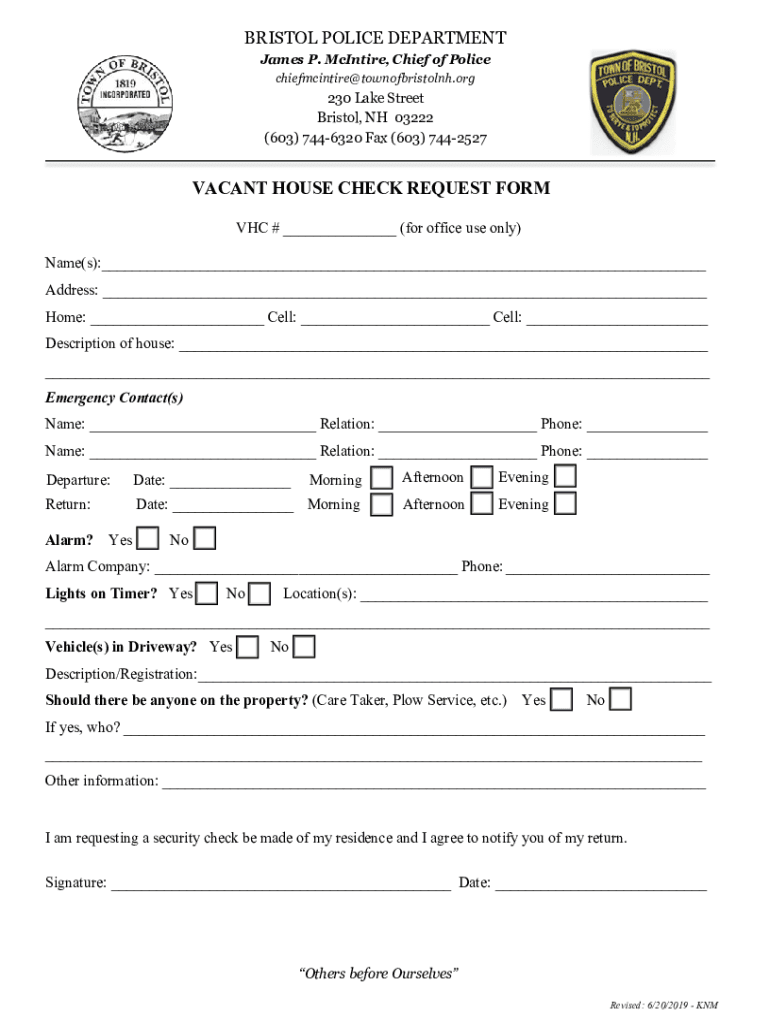 BRISTOL POLICE DEPARTMENT James P. McIntyre, Chief of Police chiefmcintire townofbristolnh.org230 Lake Street Bristol, NH 03222 (603) 7446320 Fax (603) 7442527VACANT HOUSE CHECK REQUEST FORM VHC #