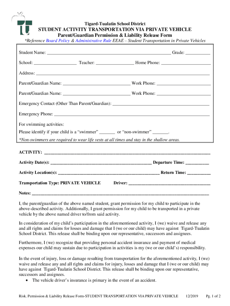 Tigard Tualatin School DistrictSTUDENT ACTIVITY TRANSPORTATION VIA PRIVATE VEHICLE Parent/Guardian Permission & Liability Release Form *Reference Board Policy & Administrative Rule EEA Student Transportation