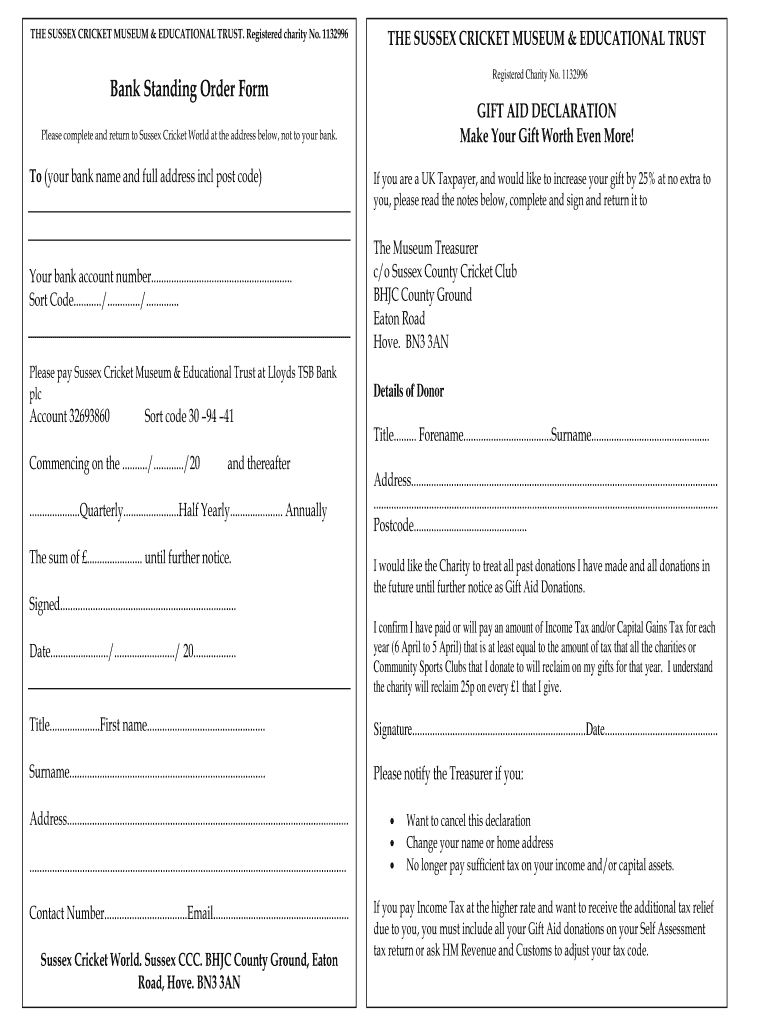The Gift Aid Declaration Form is a legal document used by UK taxpayers to increase the value of their donations to the Sussex Cricket Museum & Educational Trust by 25%.