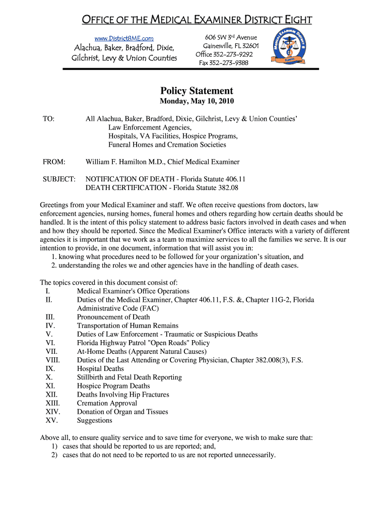 OFFICE OF THE MEDICAL EXAMINER DISTRICT EIGHT www.District8ME.comAlachua, Baker, Bradford, Dixie, Gilchrist, Levy & Union Counties606 SW 3rd Avenue Gainesville, FL 32601 Office 3522739292 Fax 3522739388Policy