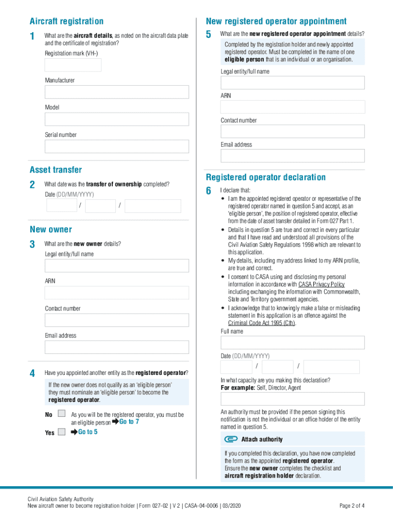 DRAFT - Form 027 Part 2 Application by New Owner to become the Registration Holder Refer to CASR 11.030 1 d 47.110 6 47.130 5 Refer to the Form 027 Part 2 Guidelines for instructions on completing and submitting this Form* Fields marked with are mandatory. CASA USE ONLY IMPORTANT INFORMATION FOR APPLICANTS 1. This form is to be completed by the New Owner of a currently VH-registered aircraft to transfer the registration of the aircraft in accordance with Civil Aviation Safety...