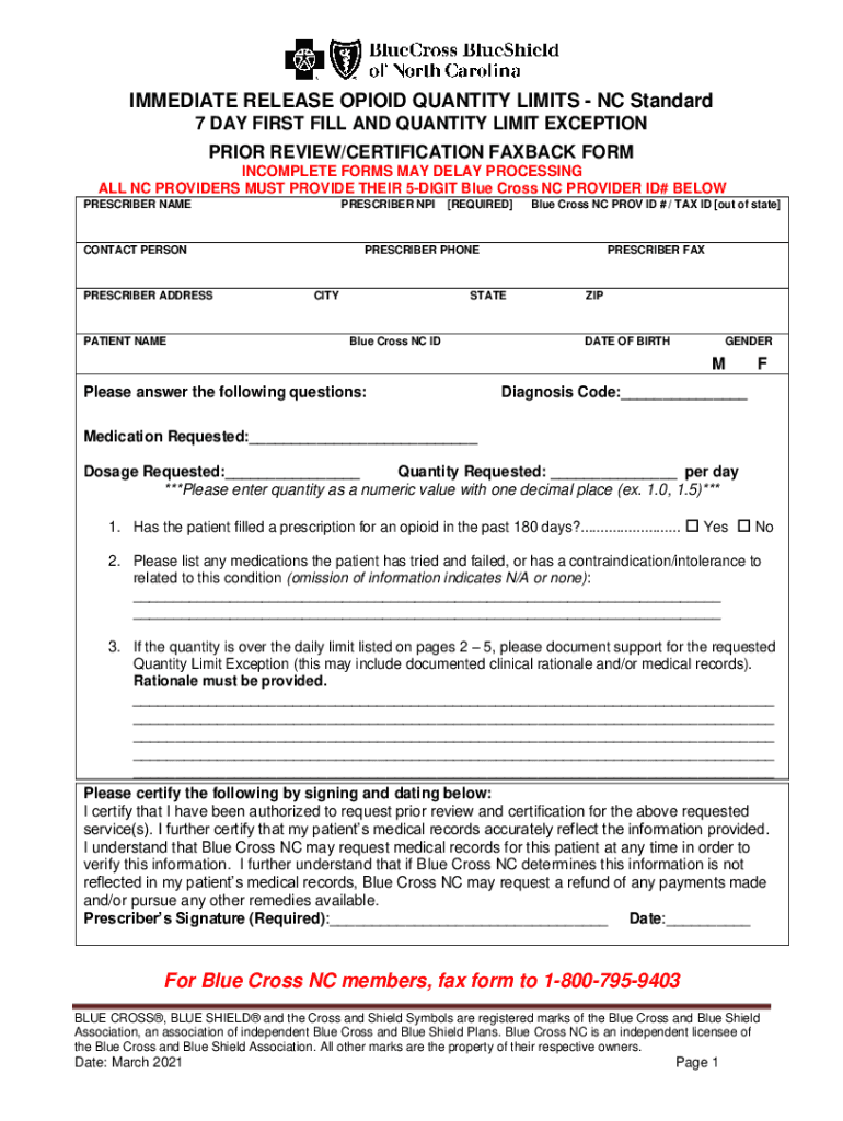 IMMEDIATE RELEASE OPIOID QUANTITY LIMITS NC Standard 7 DAY FIRST FILL AND QUANTITY LIMIT EXCEPTION PRIOR REVIEW/CERTIFICATION FATBACK FORM INCOMPLETE FORMS MAY DELAY PROCESSING ALL NC PROVIDERS MUST