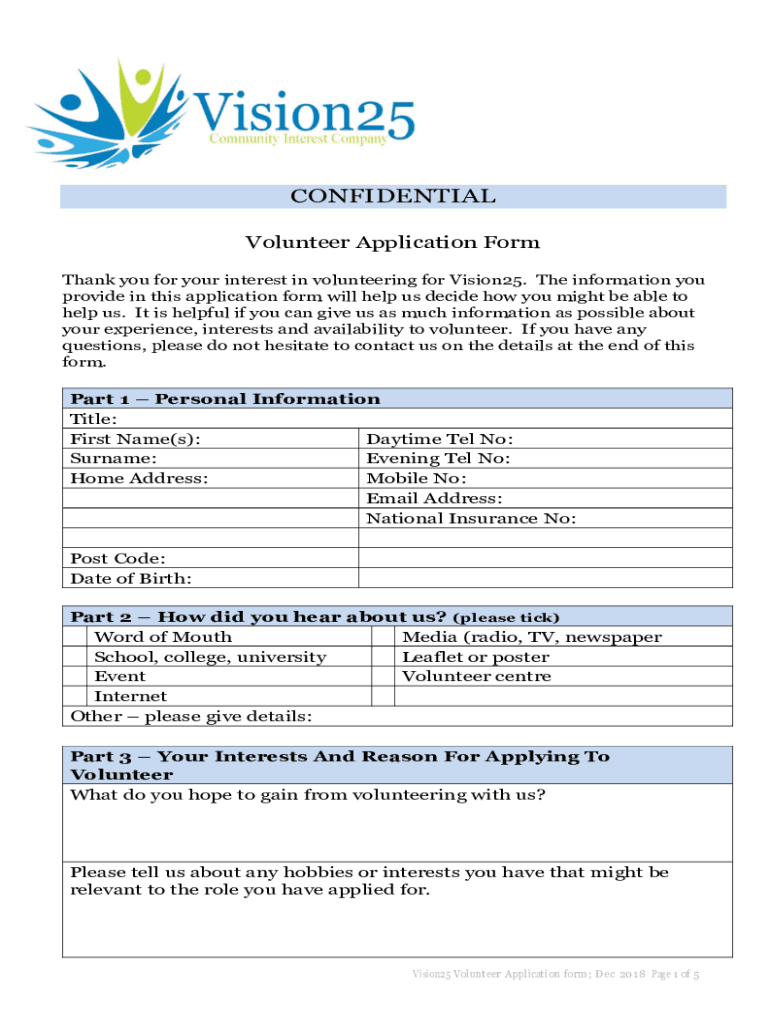 CONFIDENTIAL Volunteer Application Form Thank you for your interest in volunteering for Vision25. The information you provide in this application form will help us decide how you might be able to