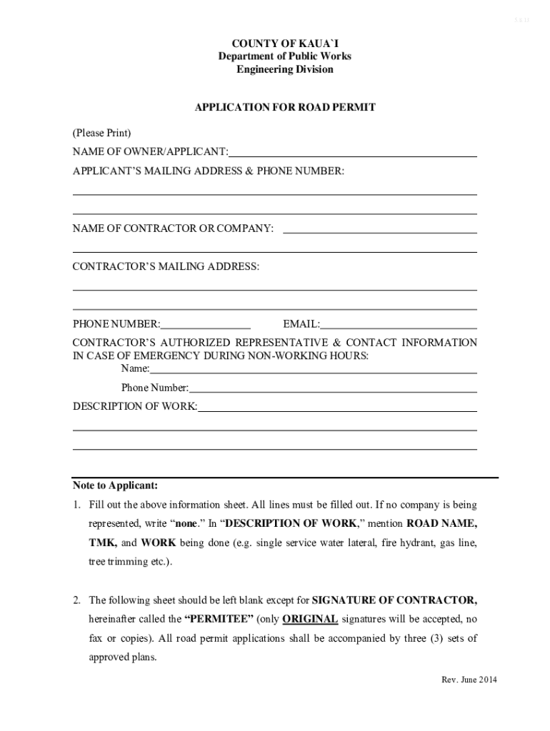 5.8.13COUNTY OF KARA I Department of Public Works Engineering Divisionalization FOR ROAD PERMIT (Please Print) NAME OF OWNER/APPLICANT: APPLICANTS MAILING ADDRESS & PHONE NUMBER:NAME OF CONTRACTOR