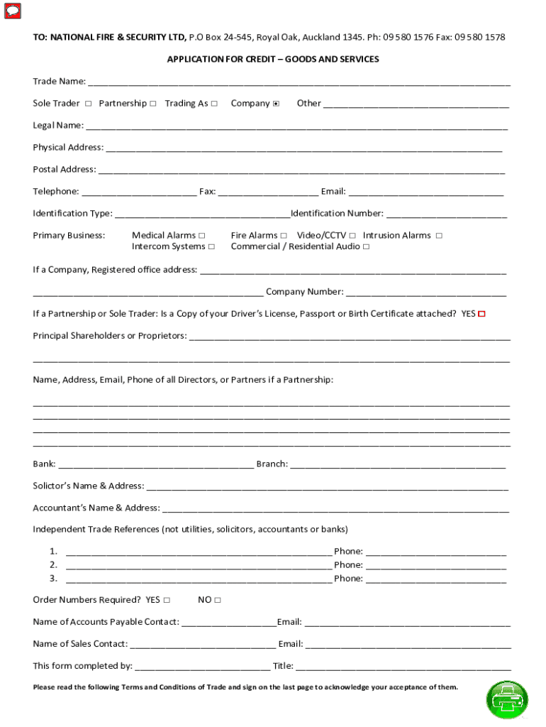 TO: NATIONAL FIRE & SECURITY LTD, P. O Box 24545, Royal Oak, Auckland 1345. PH: 09 580 1576 Fax: 09 580 1578 APPLICATION FOR CREDIT GOODS AND SERVICES Trade Name: Sole Trader Partnership Trading As