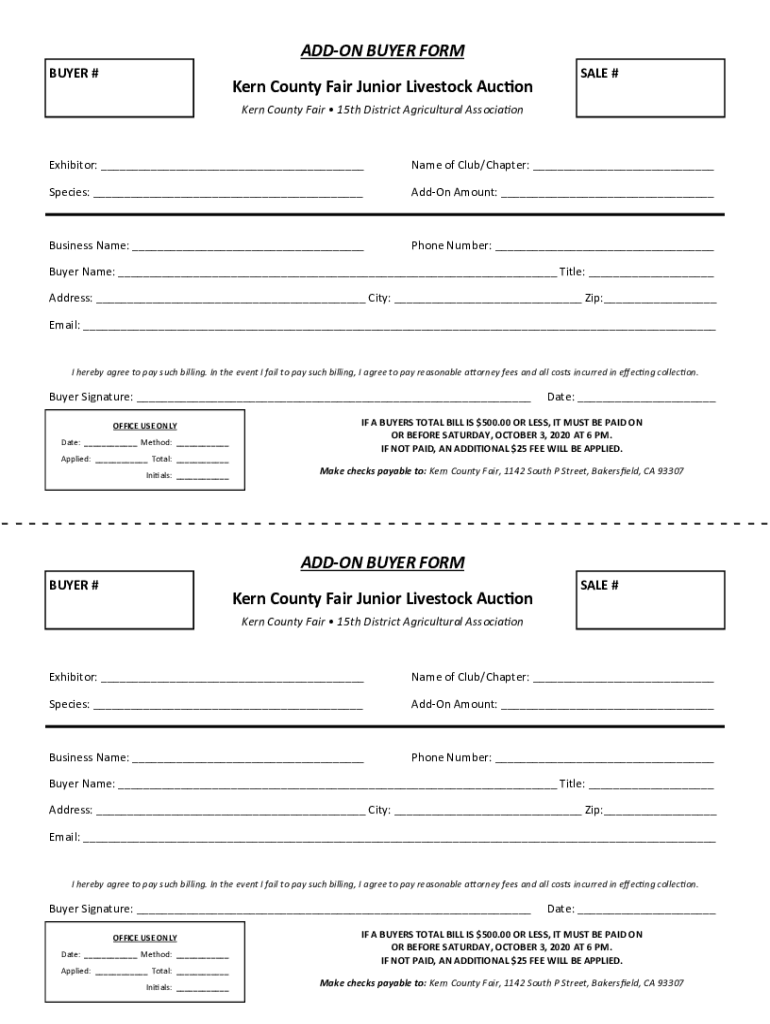 AD DON BUYER FORM BUYER#KernCountyFairJuniorLivestockAuc sale#Kern County Fair 15th District Agricultural Associate exhibitor: NameofClub/Chapter: Species: AddOnAmount: Businessman: PhoneNumber: Username: