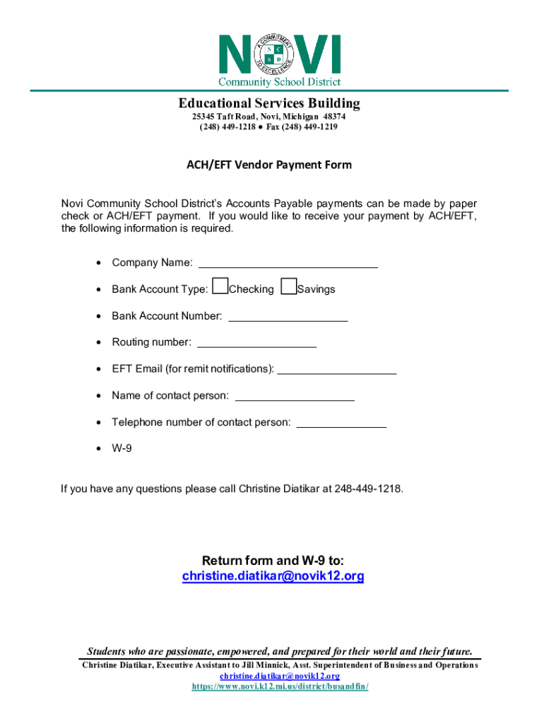 Educational Services Building 25345 Taft Road, Nova, Michigan 48374 (248) 4491218 Fax (248) 4491219ACH/EFT Vendor Payment Form Nova Community School Districts Accounts Payable payments can be made
