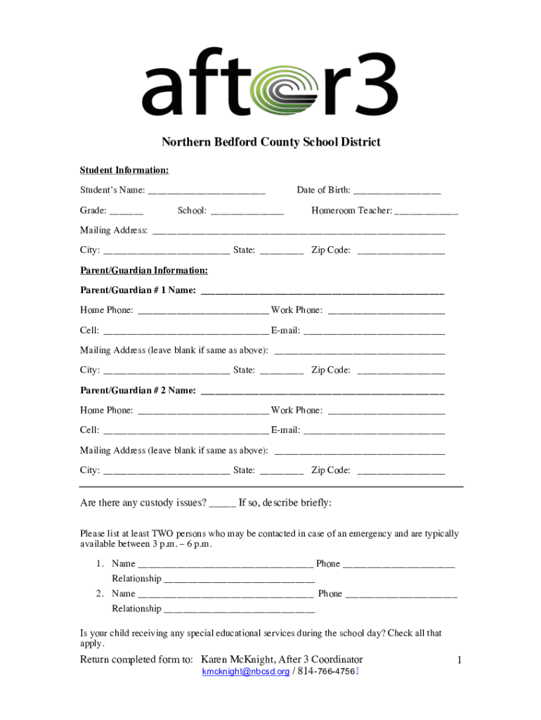 Northern Bedford County School District Student Information: Students Name: Grade: School: Date of Birth: Homeroom Teacher: Mailing Address: City: State: Zip Code: Parent/Guardian Information: Parent/Guardian