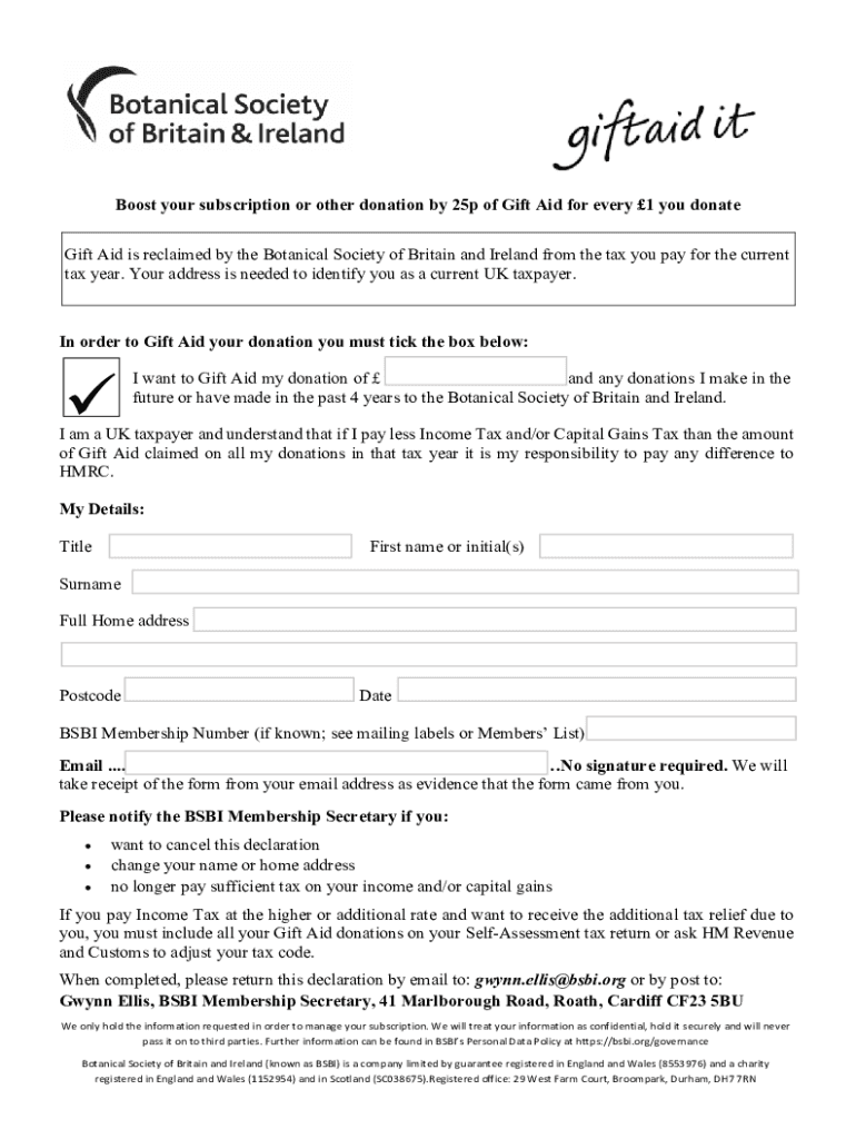 Boost your subscription or other donation by 25p of Gift Aid for every 1 you donate Gift Aid is reclaimed by the Botanical Society of Britain and Ireland from the tax you pay for the current tax year.