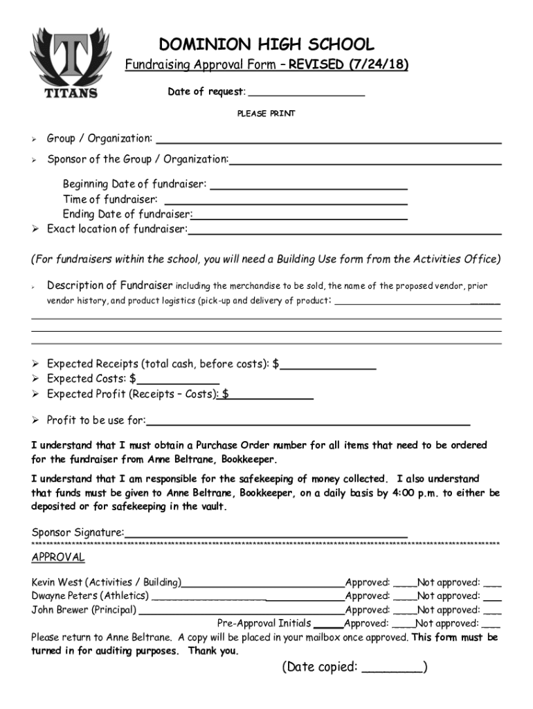 DOMINION HIGH SCHOOL Fundraising Approval Form REVISED (7/24/18) Date of request: PLEASE PRINT Group / Organization:Sponsor of the Group / Organization:Beginning Date of fundraiser: Time of fundraiser: