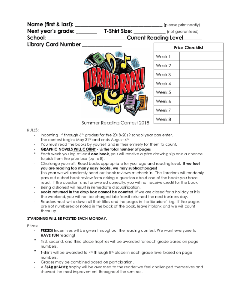 Name (first & last): (please print neatly) Next years grade: Shirt Size: (not guaranteed) School: Current Reading Level Library Card Number Prize ChecklistWeek 1 Week 2 Week 3 Week 4 Week 5 Week 6
