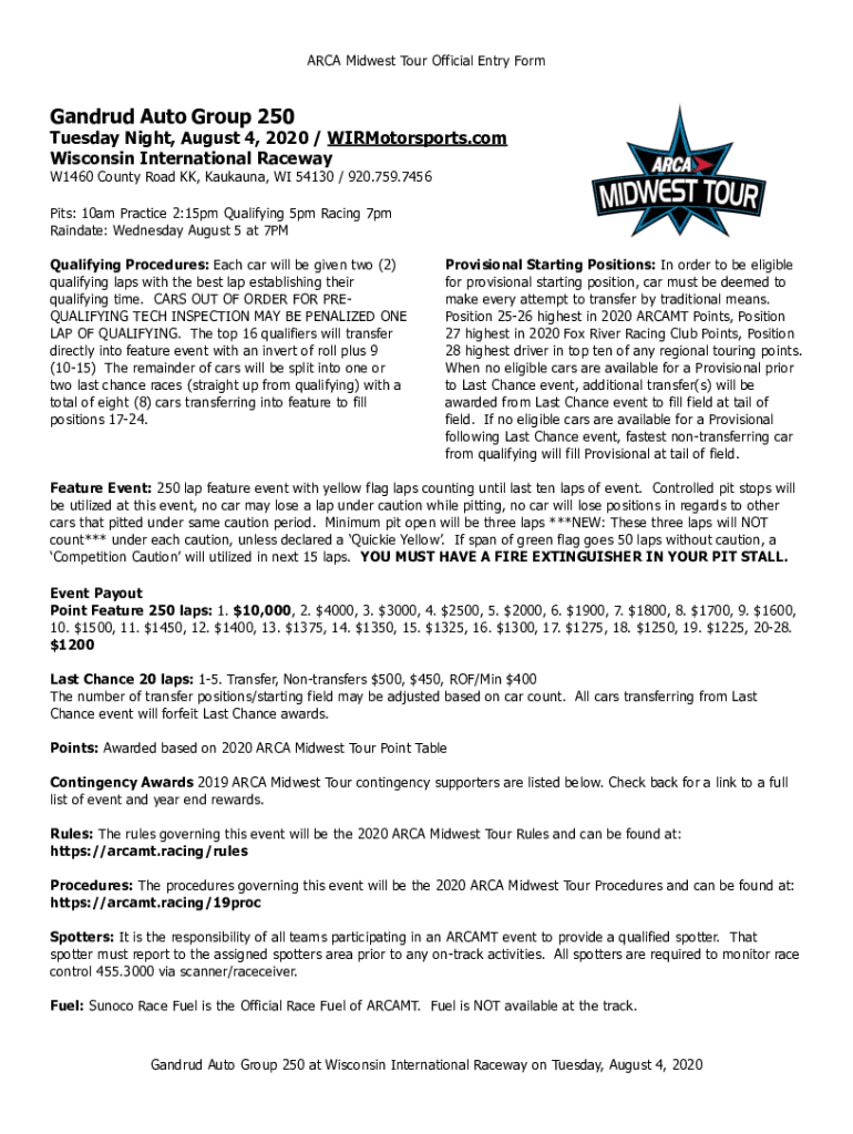 AREA Midwest Tour Official Entry FormGandrud Auto Group 250Tuesday Night, August 4, 2020 / WIRMotorsports.com
