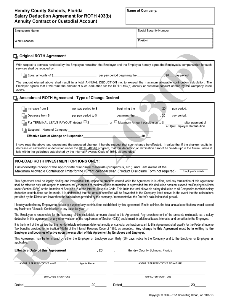 Hendry County Schools, Florida Salary Deduction Agreement for ROTH 403(b) Annuity Contract or Custodial Account Name of Company: Employees Name Social Security Number Work Location Position 40 3(b)