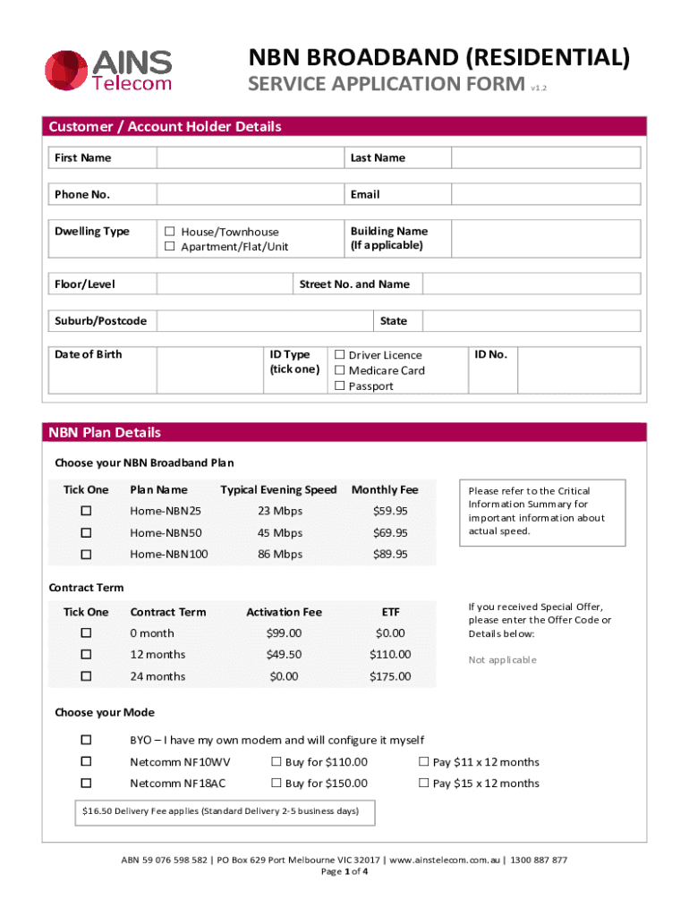 NBN BROADBAND (RESIDENTIAL) SERVICE APPLICATION FORMv1.2Customer / Account Holder Details First Nameless Telephone No. Email House/Townhouse Apartment/Flat/Indwelling Hyperloop/Overbuilding Name (If