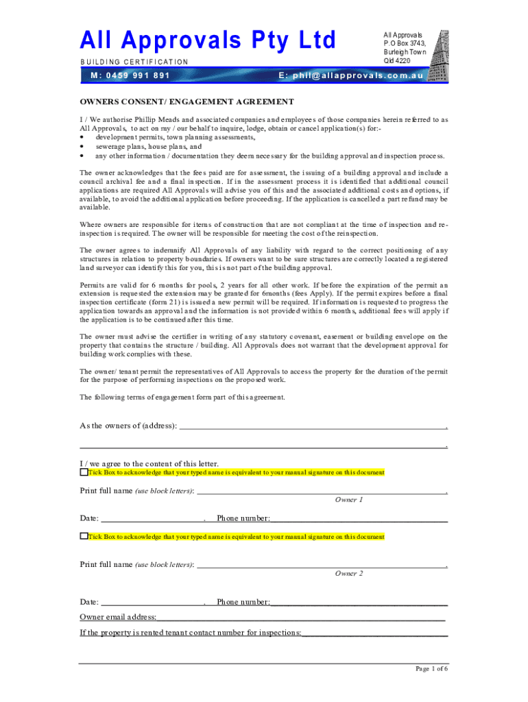 All Approvals Pty Ltd BUILDING CERTIFICATION : 045 9 9 9 1 89 1All Approvals P. O Box 3743, Burleigh Town QLD 4220E: p h i l a ll app RO val s. co m. owners CONSENT/ ENGAGEMENT AGREEMENT I / We authorize