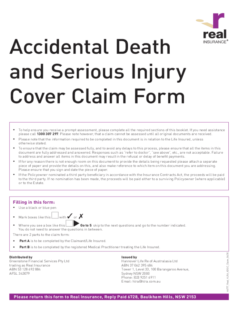 Accidental Death and Serious Injury Cover Claim Form T o help ensure you receive a prompt assessment, please complete all the required sections of this booklet. If you need assistance please call