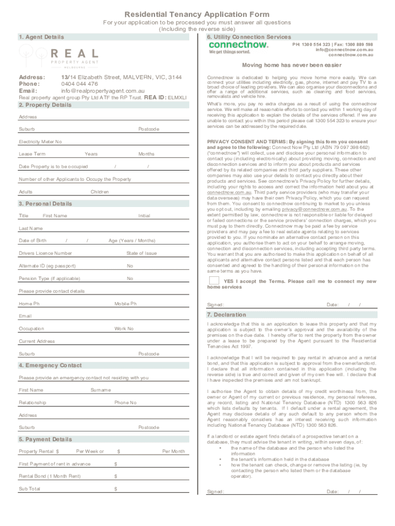 Residential Tenancy Application Form For your application to be processed you must answer all questions (Including the reverse side) 1. Agent Details6. Utility Connection Services PH: 1300 554 323