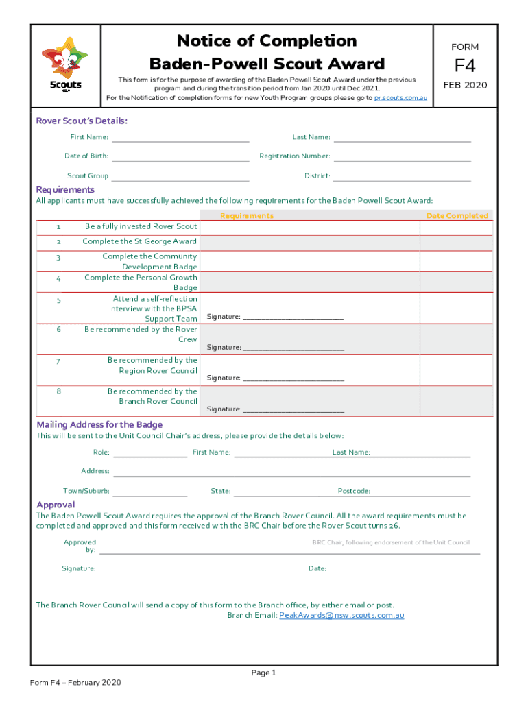 Get the free Notice of Completion FORM Baden-Powell Scout Award F4