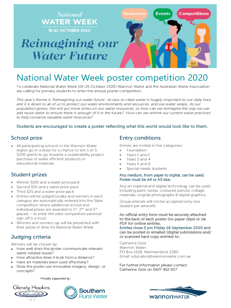 National water week cover can be filled out online or submitted in person at the designated government office. It requires detailed information on water usage, conservation measures, and impact assessment.