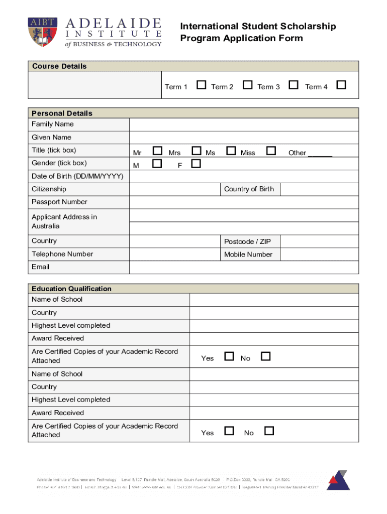 International Student Scholarship Program Application Form Course Details Term 1Term 2Term 3Term 4Personal Details Family Name Given Name Title (tick box)Gender (tick box’M Mrs F Ms Misstate of