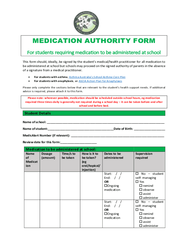 MEDICATION AUTHORITY FORM For students requiring medication to be administered at school This form should, ideally, be signed by the students medical/health practitioner for all medication to be administered