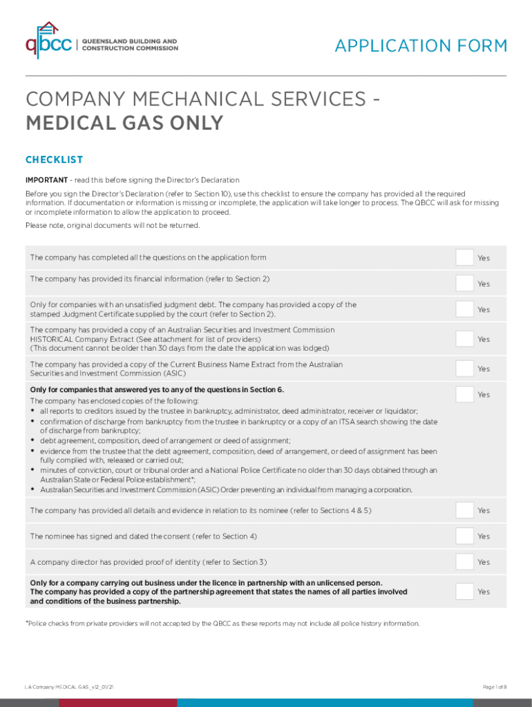 APPLICATION FORMCOMPANY MECHANICAL SERVICES MEDICAL GAS ONLY CHECKLIST IMPORTANT read this before signing the Directors Declaration Before you sign the Directors Declaration (refer to Section 10),