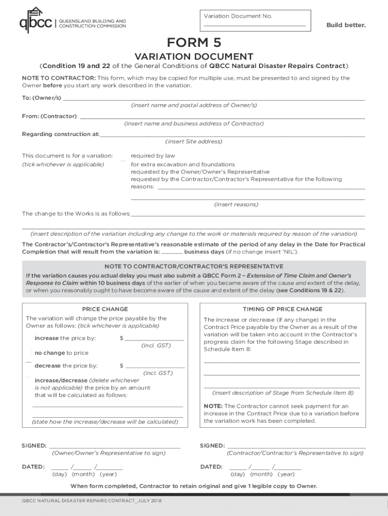 Variation Document No. Build better. FORM 5 VARIATION DOCUMENT(Condition 19 and 22 of the General Conditions of BCC Natural Disaster Repairs Contract) NOTE TO CONTRACTOR: This form, which may be copied