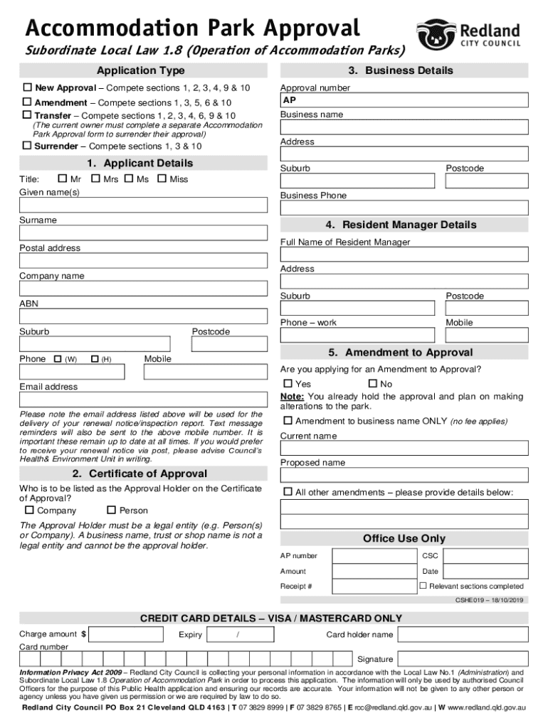 Accommodation Park Approval Subordinate Local Law 1.8 (Operation of Accommodation Parks) Application Type3. Business Details New Approval Compete sections 1, 2, 3, 4, 9 & 10 Amendment Compete sections