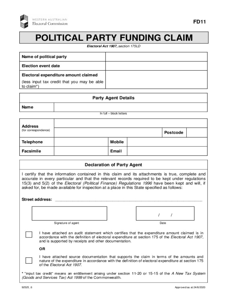 FD11POLITICAL PARTY FUNDING CLAIM Electoral Act 1907, section 175LDName of political party Election event date Electoral expenditure amount claimed (less input tax credit that you may be able to claim*)Party