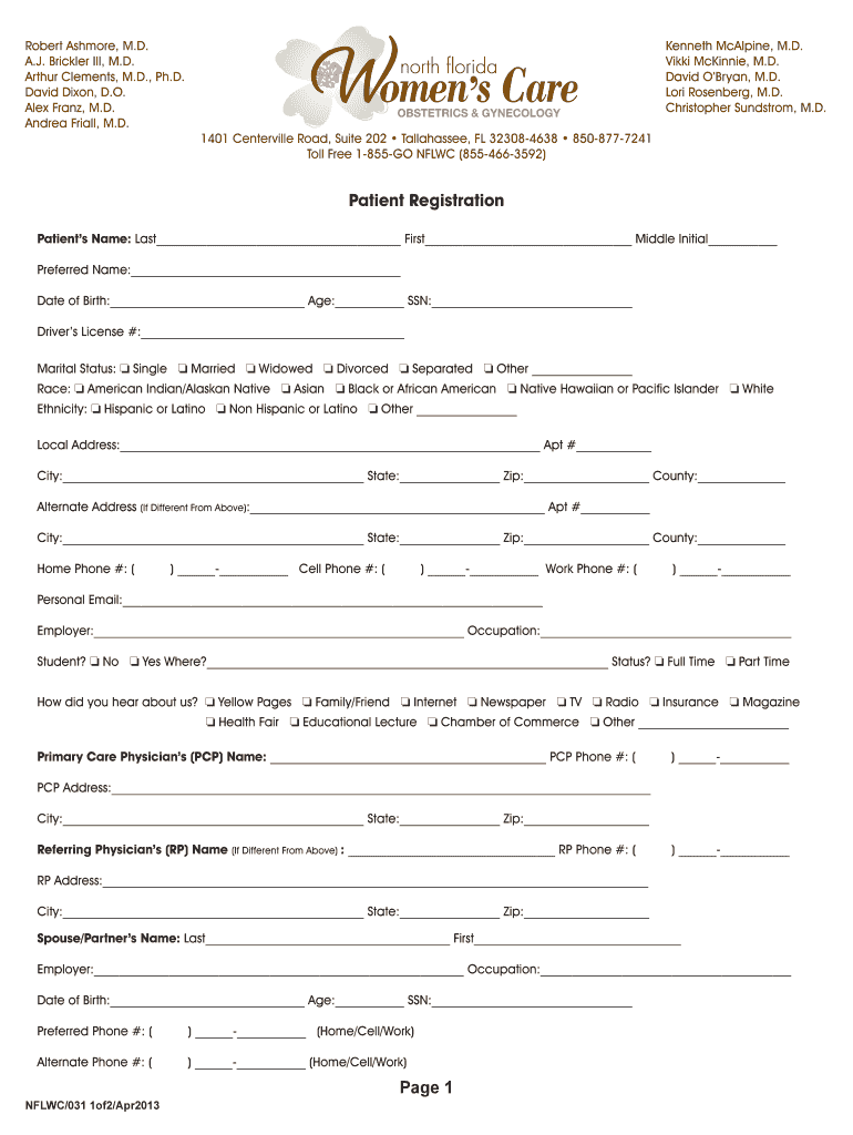 The Patient Registration Form is a healthcare document used by North Florida Women’s Care to collect essential personal and medical information from new patients.