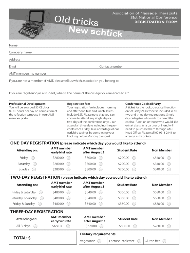 Association of Massage Therapists 31st National Conference REGISTRATION Formed tricks New sch tic k Name Company name Address EmailContact number AMT membership number If you are not a member of AMT,