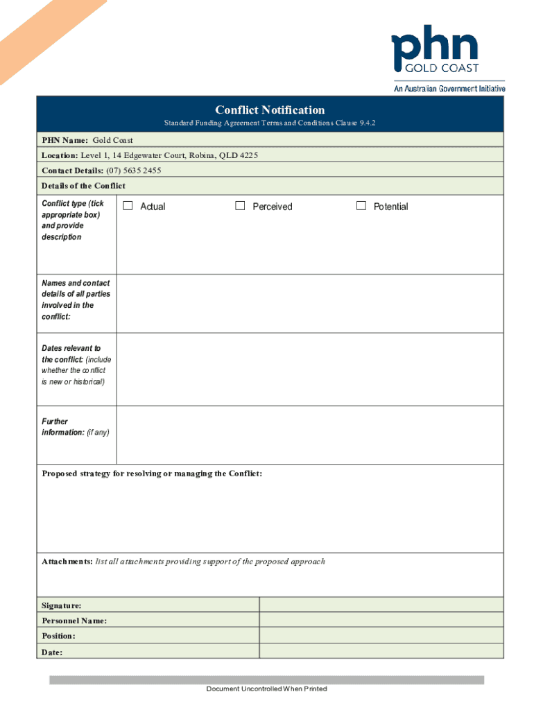 Conflict NotificationStandard Funding Agreement Terms and Conditions Clause 9.4.2PHN Name: Gold Coast