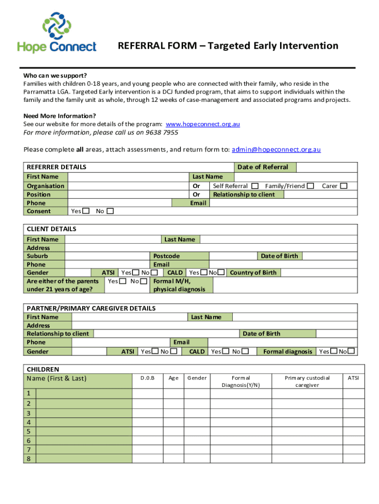REFERRAL FORM Targeted Early Intervention Who can we support? Families with children 018 years, and young people who are connected with their family, who reside in the Parramatta LGA. Targeted Early
