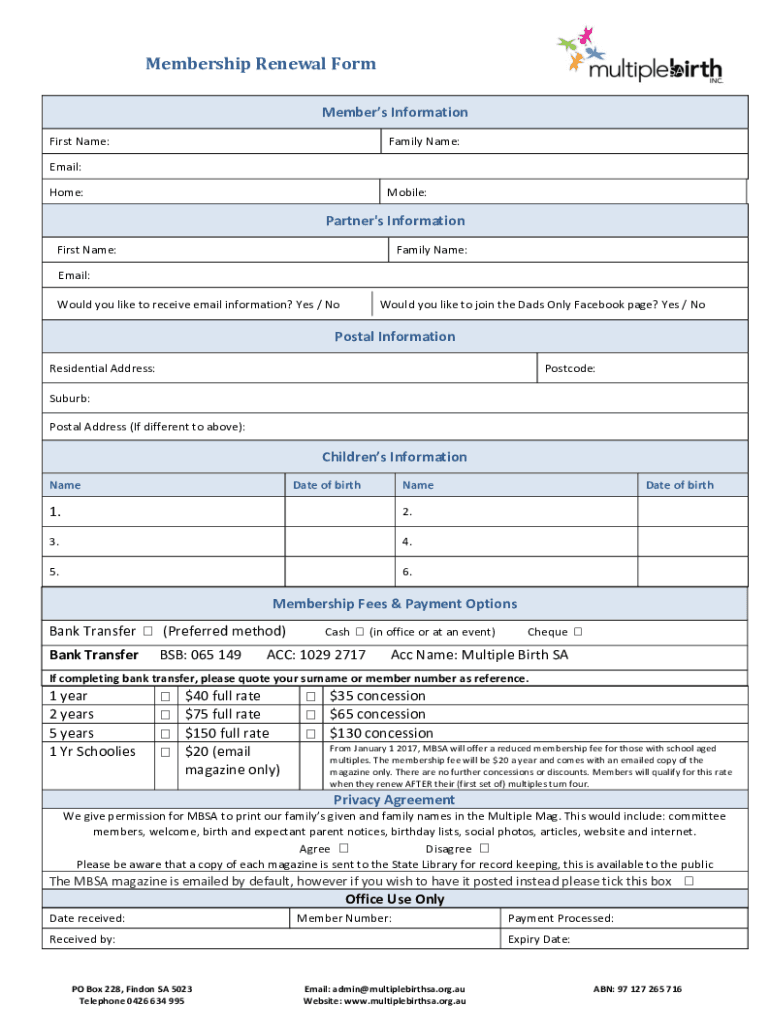 Membership Renewal Form Members Information First Name:Family Name:Email: Home:Mobile:Partner's Information First Name:Family Name:Email: Would you like to receive email information? Yes / Would you