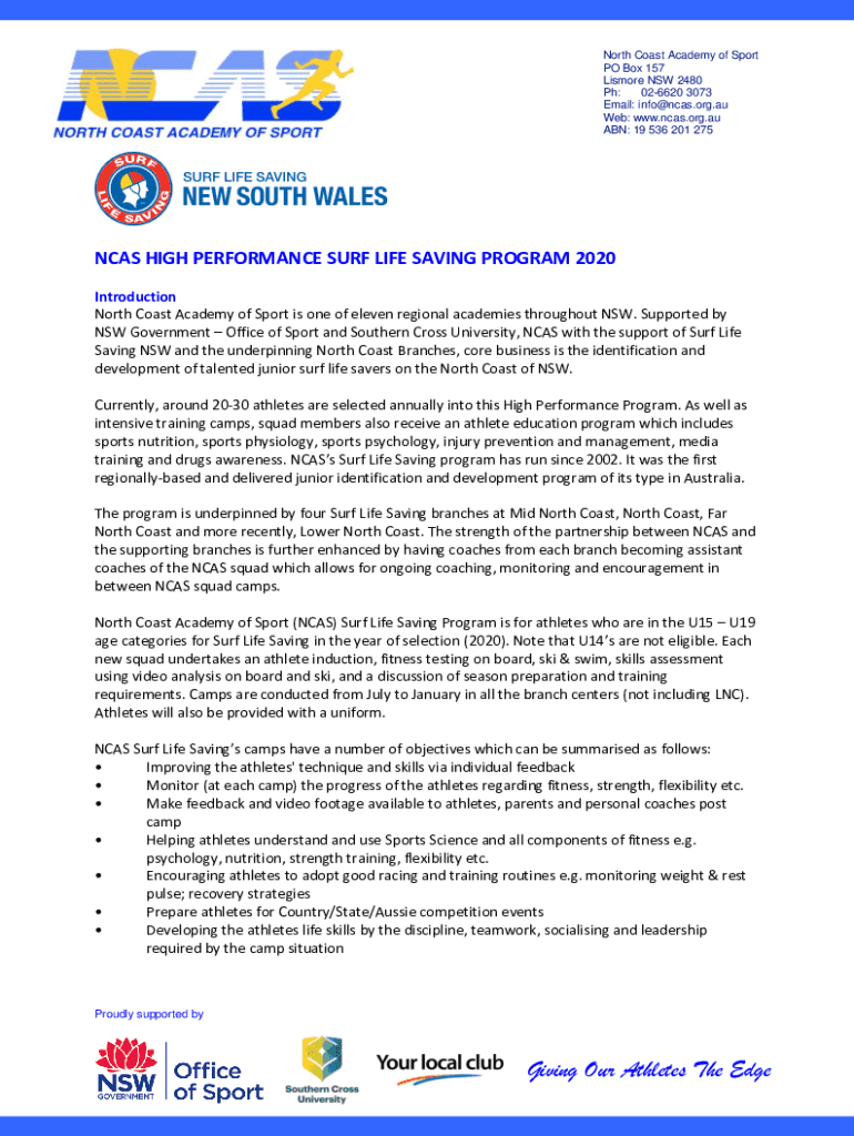 North Coast Academy of Sport PO Box 157 Gilmore NSW 2480 pH: 026620 3073 Email: info NCAA.org.AU Web: www.ncas.org.au ABN: 19 536 201 275NCAS HIGH PERFORMANCE SURF LIFE SAVING PROGRAM 2020 Introduction